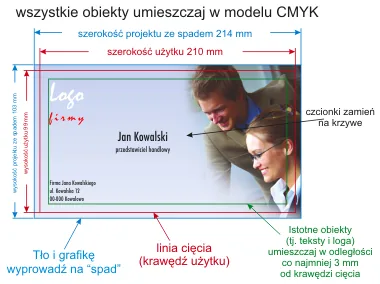 Projekt musi mieć wymiary o 2 mm większe z każdej strony w stosunku do rozmiaru użytku. Jeżeli jakieś obiekty wystają poza obszar projektu należy je obciąć. (Patrz rysunek) tj.: 214 x 103 mm