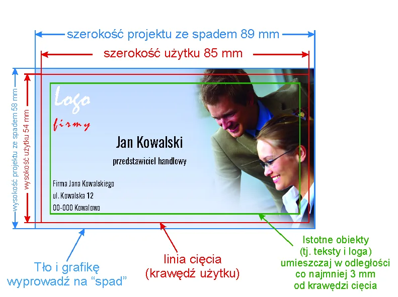Nawet jeśli twoja praca nie posiada tła wyprowadzonego na spad, format projektu musi być zachowany. Dlatego format projektu należy ograniczyć prostokątem o wymiarach 89 x 58 mm na najniższej warstwie, bez konturu (outline) i wypełnienia, lub (w przypadku pliku rastrowego) odpowiednio wykadrować projekt tak aby miał on odpowiednie wymiary.