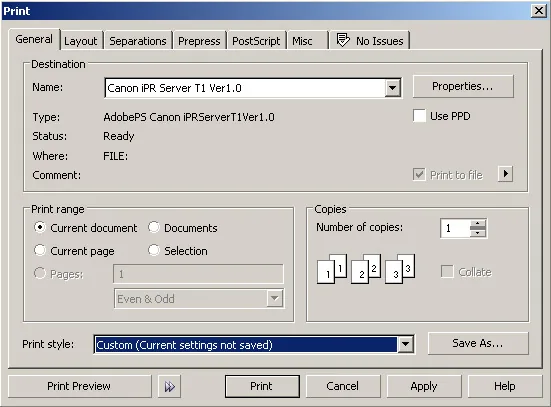 W zakładce General wybieramy drukarkę "Canon iPR Server T1 Ver1.0", a następnie wchodzimy do "Właściwości" ("Properties")