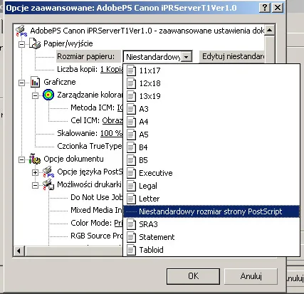 W okienku Opcje zaawansowane wybieramy format pracy, jeżeli jest niestandardowy wybieramy "Niestandardowy rozmiar strony PostScript"