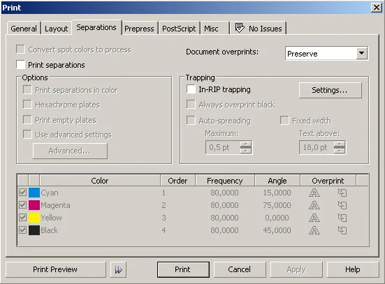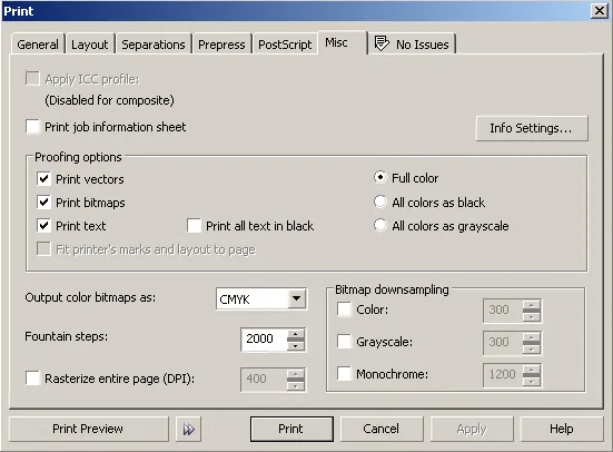 Następnie przechodzimy do zakładki "Misc" i ustawiamy wszystkie opcje jak poniżej (najważniejsze: Output color bitmaps as: CMYK i Fountain steps: 2000)