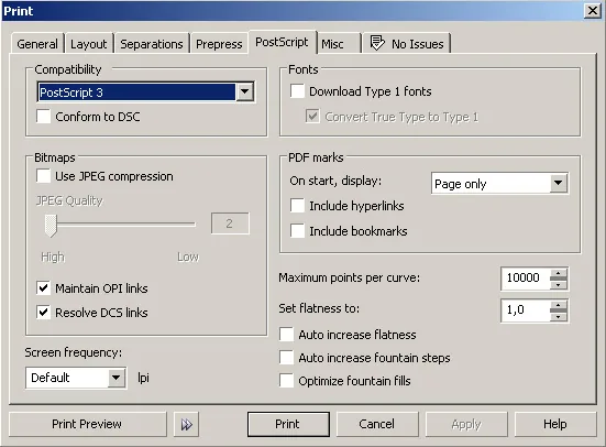 W zakładce "PostScript" należy pamiętać aby odznaczyć "Download Type 1 fonts"
