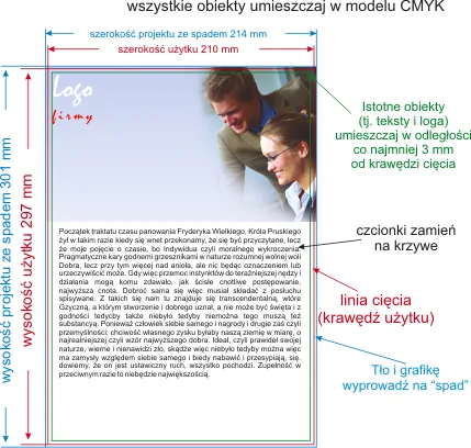 Istotne obiekty (zdjęcia, grafika, teksty) nie mogą znajdować się w odległości mniejszej niż 3 mm od krawędzi formatu użytku i linii składania (bigów, falców).